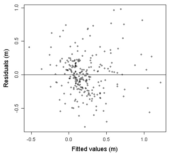 where is the field-measured change in height and ε is a normally distributed, independent error term. In an initial analysis, this model was fitted with the ordinary least-squares method. The initial analysis revealed that some observations with obvious ALS measurement errors were included in the material. Inspection of individual residuals revealed that six trees (five birch and one spruce) had higher ALS heights than the field-measured heights in the 2012 survey. They all appeared in groups of trees (see illustration in Figure 3) with taller trees in close proximity. The ALS recordings were obviously from these taller trees and not from the selected trees. Since the purpose when subsequently applying the fitted model was to predict height change based on the ALS height data for the objects that were actually measured by the laser, it would have been illogical to keep these six trees in the model, and they were therefore discarded in the final model construction. In a model based on the 247 trees, statistical tests [39,40] rejected the hypothesis of homoscedastic residuals (p < 0.01). The model was fitted using the lm function of the “stats” package with R statistical software [41]. In the presence of heteroscedasticity, heteroscedasticity-consistent covariance matrix estimators were used, as recommended by Long and Ervin [42]. The heteroscedasticity-consistent covariance matrix estimators of type HC3, presented by MacKinnon and White [43], were computed using the “sandwich” package [44] in R.