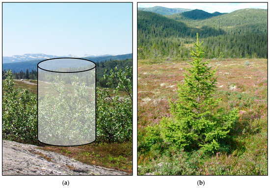 The world’s climate will undergo distinct alterations over the coming decades, leading to rapid changes in basic growth factors, such as temperature and precipitation. This will influence the boreal forest and its transition zones, leading to an increase in productivity [1]. Because the montane and northern forests found in the transition zones between the boreal forest and the alpine and tundra regions appear in areas where trees exist close to their tolerance limit in terms of temperature, these areas are characterized by steep temperature–productivity gradients. Even a moderate increase in temperature may therefore lead to a rapid increase in the growth of existing trees [2,3], as well as colonization of treeless areas and migration of the tree lines [4]. The dynamic global vegetation models predict that by the end of the 21st century, the area of the arctic tundra will be reduced by 40% [5,6]. Other drivers of vegetation change also exist at the forest–tundra interface, like herbivory [7,8,9]. Summer farms and grazing by domestic animals, such as cattle and sheep, have been common in many montane areas. Both the animals themselves and the human activity related to summer farming, such as harvest of wood, have had large impacts on the montane forest and the tree line [7]. In areas where summer farming and grazing animals have previously limited tree growth, the tree line and the montane forest may thus expand towards higher elevations when this activity is reduced. Migration of the alpine and northern tree lines will influence future carbon pools. A need therefore exists to monitor vegetation changes in these ecotones [10].