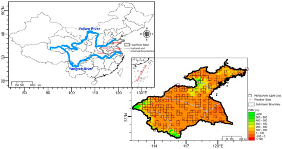 The study region is the HRB (between 30–39°E and 111–123°E), located in eastern China between the Yellow River and the Yangtze River (Figure 1). Covering a drainage area of approximately 33,000 km2, the HRB mainly includes the northern parts of Jiangsu and Anhui, a small part of Hubei, and most of Shandong and Henan. As one of the ten water resource regions in China, the HRB has a vast plain with many lakes and depressions, and is moderately mountainous (general elevation ranging from 1000 to 2000 m above sea level) near the western boundary, mid-eastern part, and Shandong peninsula. A typical semi-humid monsoon climate with warm temperatures prevails in this basin, with regional average annual temperature and precipitation of about 14 °C and 806 mm, respectively. In the HRB, precipitation is concentrated in the Meiyu rain season of China (from mid-May to mid-October) and has large annual and seasonal variability [66]. Because of the unique climate and specific surface conditions, the HRB often suffers from flooding, waterlogging, drought, and storm surge disasters, especially in its middle and lower parts [66].