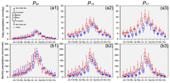 Intra-annual cycles of multi-year mean daily (a1–a3) and monthly precipitation (b1–b3) of OBS and PERSIANN-CDR, which are computed with different thresholds of OBS daily precipitation. Red and blue indicate OBS and PERSIANN-CDR, respectively.