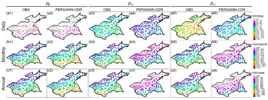 Spatial patterns (a1–a6,b1–b6,c1–c6) of multi-year mean daily, monthly, and annual precipitation of OBS and PERSIANN-CDR, which are computed using different thresholds of OBS daily precipitation.