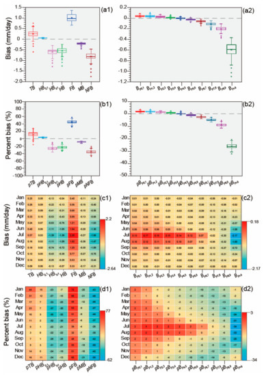 Bias and its sub-components on a daily scale, with their intra-annual cycles. (a1,b1) show detection-based biases, and (a2,b2) show percentile-based sub-components; (c1,c2,d1,d2) suggest intra-annual cycles of detection-based (percentile-based) biases. B = bias, TB = total B, HB = B in successful detections, MB = B, due to rainfall misses, FB = B because of false detections, HB0,1 = HB for rainfall between 0 mm/day and 1 mm/day, HB≥1 = HB for rainfall above 1 mm/day, NFB = HB≥1 + MB, and BPi,i+1 represents B within [Pi, Pi+1). The percentage expressions of these metrics are labelled with a header of “p”.