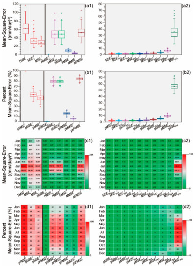 Figure 5(c1) shows that the TMSE and its systematic and random sub-components, as well as detection-based error exhibit seasonality. They increase from January, peak in July, and then decrease. Although there exists seasonality for pMSEs and pMSEr (left of Figure 5(d1)), their major characteristics markedly different from those of the TMSE, i.e., larger pMSEs (> 60%) in April–June, but larger pMSEr (> 40%) in January–March and August–December. The pHMSE shows an intra-annual cycle similar to the TMSE, but with a maximum of 83% in June (right of Figure 5(c1,d1)), while pFMSE (pMMSE) values above 20% (10%) are detected in January–April, November, and December (January, February, and October–December). Except for in November, MSEs (pMSEs) always contributes more to the error. Comparisons among the detection-based error sub-components for each month suggest that the largest error proportions exist in HMSE (pHMSE) because of the largest error of PERSIANN-CDR estimations of daily precipitation above 1 mm/day. Between March and October (Figure 5(c2,d2)), the percentile-based error sub-components become larger as percentile increases; however, in the following four months, these variables first increase and then decrease, with the maximum arising between P7 and P9.