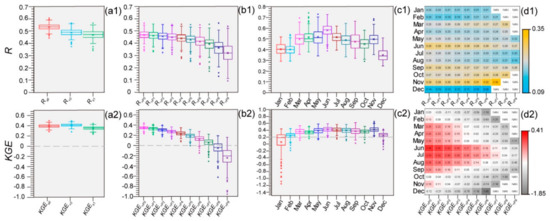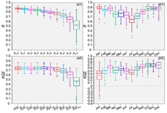 R (a1) and KGE (a2), which are calculated using data above OBS monthly precipitation percentile thresholds, and intra-annual cycles of R (b1) and KGE (b2) estimated with all monthly data.