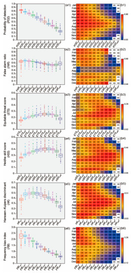 As plotted in Figure 7(b1), the behavior of POD in each month shows a decrease as the precipitation threshold increases. Basically, the PERSIANN-CDR product throughout the year corresponds to good performance for precipitation below P4, particularly in June–August, with POD larger than 0.50 continuing until P7. At a given threshold, the corresponding POD shows obvious seasonality, with a peak always occurring in July. FAR (Figure 7(b2)) indicates that more than 50% of precipitation detections are incorrect at almost all thresholds for each month, particularly for precipitation in January–June and September–December below P7, with FAR values larger than 60%. This metric’s fluctuations in each month are characterized by an initial increase, followed by a decrease, and finally, an increase (except for March–May) with increasing thresholds. The monthly pattern of this categorical indicator is similar to that evaluated using all daily data (Figure 7(b2)). Figure 7(b3) shows that the ETS values are all smaller than 0.30. Moreover, the maxima occurs in June–August and the remaining months correspond to precipitation thresholds above and below P5, respectively. HSS (Figure 7(b4)) values do not exceed 0.50, but in each month, the precipitation threshold corresponding to the largest HSS is different, i.e., P1–P4 for January–April and September–December, and P4–P6 for May–August. Except in July and August, when HK values are large than 0.50 for precipitation thresholds between P2 and P6 (Figure 7(b5)), this indicator’s values are all below 0.50 for other months. In particular, the HK values for thresholds above P6 (P3) in January–April and September–November (December) and above P8 in the remaining months are lower than 0.30, which suggests poor PERSIANN-CDR performance. Overall, FBI behavior generally shows a decrease with increasing percentiles for each month (Figure 7(b6)). However, different tendencies to underestimate or overestimate precipitation events are found among the percentiles. For example, PERSIANN-CDR generally overestimates precipitation below P4 in January–May and October–December, especially for precipitation below P1, with an FBI larger than 3.00. However, it underestimates other precipitation events, e.g., precipitation above P6 having an FBI of less than 0.50. In June–September, most precipitation events are overestimated by the PERSIANN-CDR product.