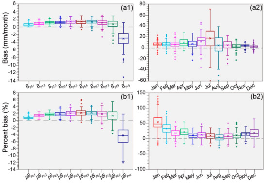 where HMSE, MMSE, and FMSE are errors in successful detections, errors, due to rainfall misses, and errors, due to false detection, respectively. MSEPi,i+1 represents the error for the bin of [Pi, Pi+1), as defined as above. The percent values of HMSE, MMSE, FMSE, NFMSE, and MSEPi,i+1 (named pHMSE, pMMSE, pFMSE, pNFMSE, and pMSEPi,i+1) can be obtained by dividing its value by TMSE. Notably, in this study, we calculated these selected validation metrics at 176 grid boxes, and utilize their means to detect PERSIANN-CDR performances in the HRB. Moreover, the box-plots for each validation metric in the following text are drawn using their estimates at all the grid boxes.