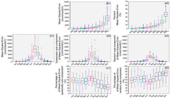 Percentile-based Mean-Square-Error (a1,a2); intra-annual cycles of Mean-Square-Error (b1) and its systematic and random sub-components (b2,b3,c1,c2), which are calculated using monthly data. MSEPi,i+1 represents Mean-Square-Error within [Pi, Pi+1), with its percentage expression labelled as a header of “p”.