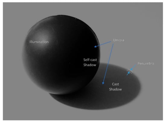 The physics, properties, and classification of shadow are detailed in the works of Funka-Lea and Bajcsy [] and Arévalo et al. []. Shadow is categorised into either cast or self-cast shadow, as shown in Figure 1.