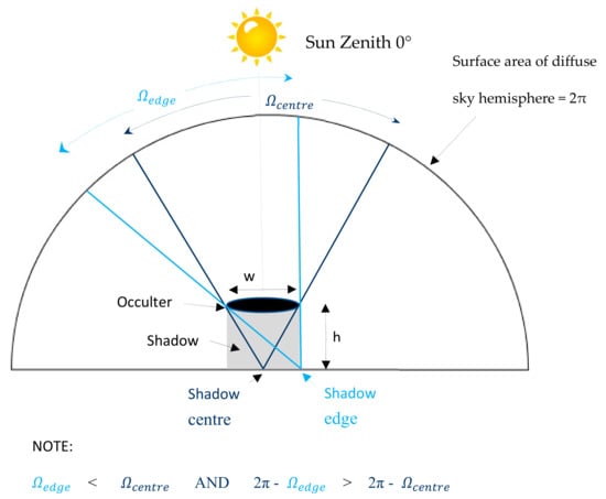 A thorough study of shadows by Lynch [] examined their theoretical properties and compared them to field-based results from shadows generated by a black circular occulter. The study theoretically modelled shadow illumination and brightness by hemispherical integration of sky radiance, sun radiance, and upward-pointing solid angles subtended by the occulter. Lynch [] demonstrated that shadows are a 3D volumetric phenomenon influenced by sun zenith and sky radiance. The field-based design suspended a black circular occulter at various heights to cast shadow onto a diffuse white horizontal surface. Comparison of theoretical and field-based results showed that brightness within any part of a shadow cast by a black circular occulter is proportional to the amount of hemispherical sky radiance visible from that part of the shadow. The proportion is calculated using subtended solid angles (Ω) with an example of two different angles shown as a 2D representation of a 3D reality in Figure 2.