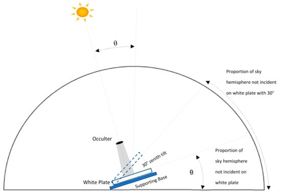 From Figure 3 it can be observed that there are two variables that change. One variable is the required treatment for our experiment, the reference panel zenith changes to simulate shadow shape and depth. The other variable is the amount of solid angle sky hemisphere Ω incident on the shadow with each zenith change. Figure 4 highlights this by showing that adjustment of the supporting base to be normal to the Sun reduces the sky hemisphere incident on the reference panel. It also shows that a further 30° zenith tilt of the reference panel reduces that sky hemisphere even further. It is important to highlight this because sky hemisphere exposure is fundamental to the brightness hypothesis of Lynch []. However, pre-processing calibrations to the spectrometer and Canon 450D negate this effect and are discussed in the Sensors section further below.