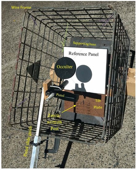 Prior to shadow signature capture at each zenith iteration, the FR Spectroradiometer was optimised and dark current corrected to reflectance in situ using a non-shadowed portion of the reference panel. The foreoptic lens targeted a non-shadowed portion of the panel that was sighted using the pistol slide guide. At a pistol height of 300 mm, the 3° FOV foreoptic lens captures an approximate circular footprint of 15.7 mm diameter on the reference panel, thus leaving adequate panel space to optimise. The optimisation and subsequent six shadow signatures at each zenith took less than 10 min, minimising any changes in atmospheric effects between sample and target i.e., 10 min equates to 0.3° sun zenith change. The reflectance calculation is the ratio of the shadow signature to the optimised reference panel signature, thus minimising atmospheric and illumination effects such as any irradiance obstruction from the operator, wire crate, occulter, instruments, and the sky hemisphere reductions shown in Figure 4. Estimates of measurement uncertainties in the design result from illumination variation, illumination variance caused by nearby objects, geometry of the design, Spectralon panel degradation, and the Lambertian scatter properties of the Spectralon panel [,,,]. Estimations of these measurement uncertainties by these factors are provided in the Discussion.