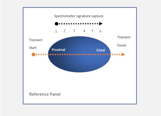 The spectrometer used was an ASD “FieldSpec® Pro FR” FR spectroradiometer (Analytical Spectral Devices, Boulder, CO) with a spectral range of 350–2500 nm and a 1 nm sampling interval. The capture of signatures is done via a hand-held pistol that is connected to the FR spectroradiometer via a fibre optics cable. The hand-held pistol can be fitted with foreoptic lens attachments that have varying field of views (FOV). For this study, a foreoptic lens with a 3° FOV was fitted to the pistol. The FR spectroradiometer is calibrated to capture reflectance using reference panel with approximately 100% reflectance across all spectra. The reference panel is a near-perfect ‘white body’ that provides a baseline to calibrate the sensor and capture real time relative reflectance.