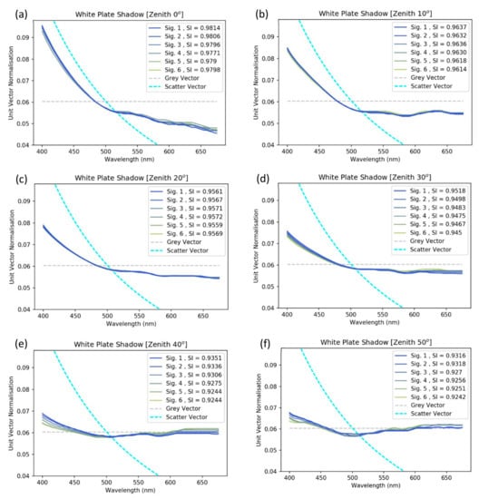 All plates in Figure 8 show a convergence point at approximately 520 nm where the scatter vector and shadow signatures are equal. For wavelengths from 400 nm–520 nm, Sig. 1 has a higher SI value than Sig. 6 and the reverse occurs from the 520 nm–675 nm wavelength range. This is more evident in the 30°, 40°, and 50° zenith plates. From Equations (1) and (4), we know the intersection of the scatter vector and grey vector is calculated at exactly 500 nm and appears correlated to the convergence point.