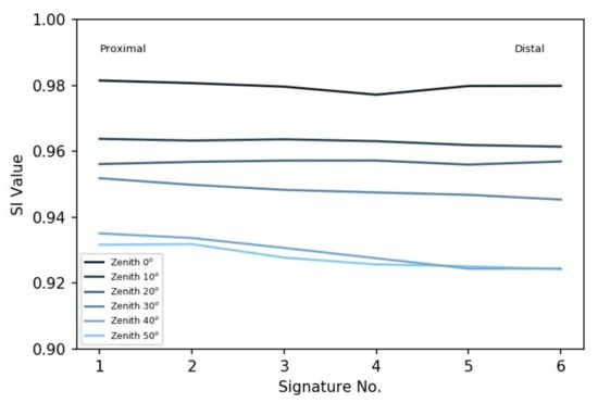 SI values are calculated for each signature at each zenith angle using the dot product from and as per Equation (3)