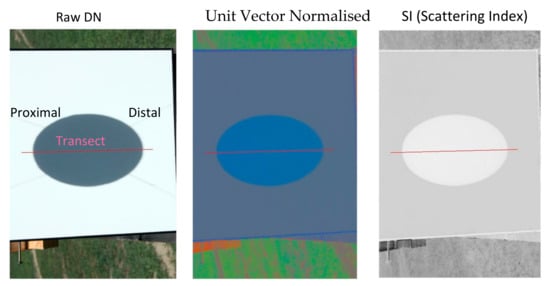 Canon 450D images for the 50° zenith showing transect location and proximal–distal parts of shadows for the raw DN image, unit vector normalised image, and the SI (scattering index) image. Images have been rotated 90° anticlockwise to show transects horizontally.