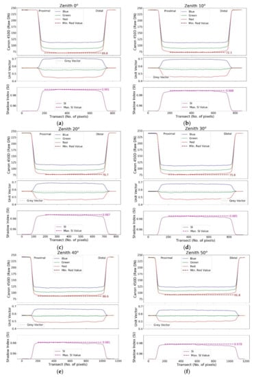 Canon 450D shadow transects showing raw DN, unit vector normalisation, and SI. Plates (a), (b), (c), (d), (e), and (f) are for zenith angles 0°, 10°, 20°, 30°, 40°, and 50°, respectively. In each raw DN transect, the minimum red band value is shown as a reference for brightness. In each unit vector transect, the grey vector is shown and for the SI transect, the maximum SI is the reference for changes in SI.