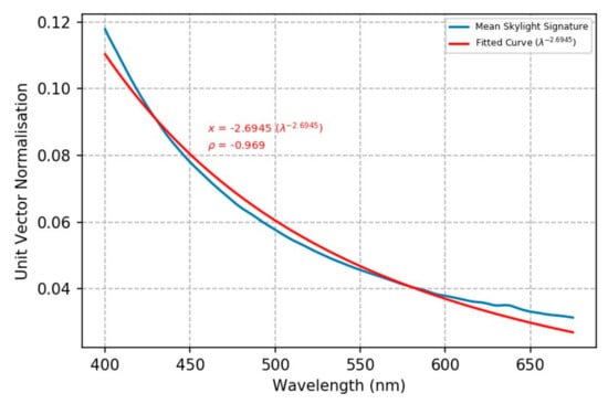 The skylight measure is obtained by a non-linear least squares curve fitting of the relative scattering model λ−x to the averaged skylight signature captured by the FR spectroradiometer. The curve fit function is applied in the Python SciPy model (scipy.optimise.curvefit) using the Levenberg–Marquardt fitting model []. The curve-fitting result will provide the best fit Angstrom-law exponent x for the relative scattering model λ−x to generate a scatter vector that matches the experiment conditions. Using Equation (1), we convert the reference scatter vector to unit form but instead of using the 400–700 nm wavelength range, we adopt the upper wavelength limit of Smax mentioned previously