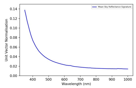 There is a requirement to define shadow and its ‘depth’ before it can be measured. Shadow is a result of illumination characteristics where direct solar irradiance of a target is obstructed and the volume of sky that is left above the target becomes the source of illumination [,,]. Since shadow response is directly related to diffuse skylight, we know that shadow appears as a ‘blue’ colour, which is a convenient definition. The definition is more scientifically defined by the exponential decay function shown by the FR Spectroradiometer signal of the sky in Figure 13. The effect is prominent within the visible domain where shorter wavelengths reflect exponentially more than longer wavelengths. For purposes of the discussion, Figure 14 highlights this effect when the FR Spectroradiometer sky signature is extended to a 350–1000 nm range. It can also be observed from Figure 14 that the nature of an exponential decay function does not entirely flatten out and never will. However, the increasingly smaller scattering influences at longer wavelengths may be of significance to hyperspectral data applications such as mineral classification where subtle changes in signatures could be critical.