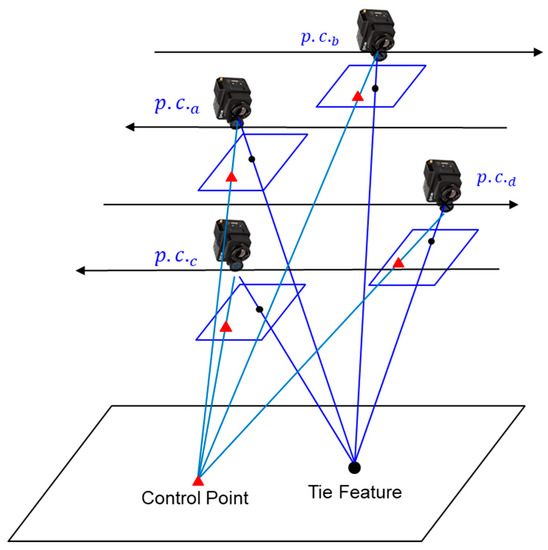 For many photogrammetric applications, the goal is to increase accuracy while decreasing the required resources. The bundle block adjustment theory is a well-known method for increasing geospatial precision and accuracy derivation from imagery by improving geometric configuration and increasing redundancy while reducing the quantity of GCPs [15]. The bundle adjustment aims to ensure the best accuracy and precision of the reconstructed object space using minimal control. A graphical illustration of the bundle adjustment target function is presented in Figure 2. It promotes flexibility among solvable unknown parameters to suit individual user needs, and, in more recent years, it has been shown to be platform agnostic and capable of simultaneously combining a variety of sensors. Ravi et al. [37] used bundle adjustment theory to simultaneously perform system calibration of a multi-LiDAR/multi-camera mobile mapping platform. Habib et al. [18] demonstrated the use of bundle adjustment for self-calibration of line cameras using linear features detected in multiple datasets. Whether using frame or line cameras, or combining multiple sensors on a single/multiple platform(s), the mathematical model and overall least squares adjustment implementation of bundle adjustment is the same.