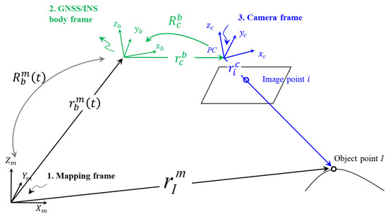 A UAV-based, GNSS/INS-assisted imaging system involves three coordinate systems: a mapping frame, an IMU body frame, and a camera frame. The mathematical model of the collinearity principle—which describes the collinearity of the camera perspective center, image point, and corresponding object point—is graphically illustrated and mathematically introduced in Figure 3 and Equation (1), respectively. The following notations are used throughout this study: a vector connecting point ‘b’ to point ‘a’ relative to a coordinate system associated with point ‘b’ is represented as , and a rotation matrix transforming from coordinate system ‘a’ to coordinate system ‘b’ is represented as .