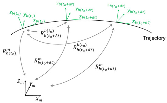 - : rotation matrix from the IMU body frame to the mapping reference frame at time derived from the GNSS/INS integration process