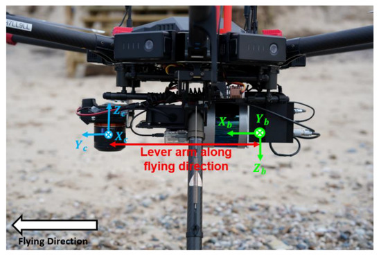 The next approach we propose to evaluate time delay is the indirect approach. This approach uses the above bias impact analysis by exploiting the fact that the lever arm component in the flying direction is correlated with the time delay, given a single linear velocity and insignificant angular velocity. In other words, if flights in opposite directions and constant linear velocity are used, then the lever arm component in the flying direction will be correlated with the time delay. As a result, by estimating the lever arm component in the flying direction, while not considering the time delay, and then comparing it with the nominal value which can be directly measured from the GNSS/INS unit to the imaging sensor, one can discern the existence of a possible time delay in system synchronization. An illustration of where measurements are taken to acquire the nominal lever arm values is shown in Figure 6. This approach is meant as a special case in which one chooses to use an existing bundle adjustment with system self-calibration mechanism to estimate time delay, instead of incorporating the time delay as a parameter and implementing the direct approach.