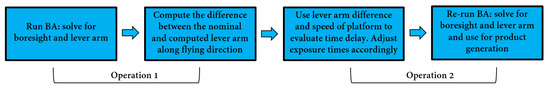 The indirect approach consists of a single bundle adjustment, with the system self-calibration operation completed twice. In the first operation, an initial GNSS/INS-assisted bundle adjustment is performed to solve for the lever arm components (only lever arm in the flying direction) and boresight angles. If a significant time delay exists, the computed lever arm in the flying direction will be quite different from the nominal value. This will be the first hint that the system may have a time delay issue. After the initial bundle adjustment is performed, the difference between the computed lever arm and the nominal/measured lever arm in the flying direction is derived. In the second operation, this difference in distance is now known and the time delay can be computed using the speed/time/distance relation. The computed time delay is then applied to derive the new position and orientation of IMU body frame at the actual exposure time. Finally, another bundle adjustment is performed to solve for the mounting parameters. Figure 7 presents the processing workflow of this approach.