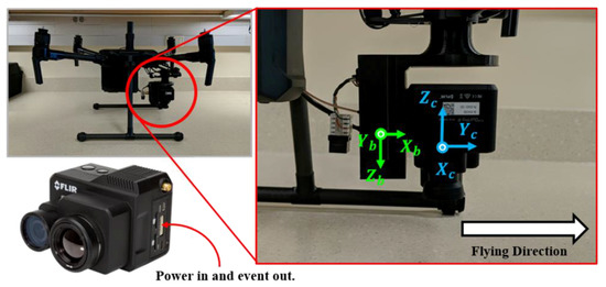 The DJI M200-based imaging system employed a FLIR Duo Pro R 640 combined thermal and RGB image sensor. The Uncooled VOx Microbolometer thermal sensor array was 640 × 512 with a pixel size of 17 μm and had a nominal focal length of 19mm. The RGB visible sensor array size was 4000 × 3000, with a pixel size of 1.85 μm and a nominal focal length of 8 mm [41]. The Duo Pro R has an internal GNSS/INS unit for in-camera geo-tagging, but that unit was not used for this study. Figure 8 shows the FLIR Duo Pro R and APX-15 configuration on the M200 UAV, and illustrates the coordinate systems for the IMU body, camera, and vehicle frames. The FLIR Duo Pro R utilized a mobile-phone based app to set camera parameters via Bluetooth. The mobile-phone based app includes the ability to set the capture interval for the camera and to start and stop triggering. Event feedback to the APX was provided directly by the FLIR Duo Pro R using the “Frame Sync” option. This option output a LVTTL (3.3 V) pulse that was wired directly to the event input of the APX-15. It is important to note that only one triggering interval and frame sync output can be set on the FLIR Duo Pro R, despite the fact that there are two sensors housed in the single unit. Therefore, one might assume that both sensors are capturing images simultaneously. However, during the experiments, the FLIR thermal and RGB sensors were treated independently as separate sensors. The system calibration parameters, including the time delay, were estimated for each senor so the results were not affected by having only one triggering interval.