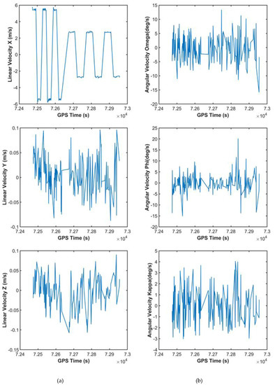 Five datasets were collected for this time-delay estimation study. Four datasets were collected across two dates, July 25th and September 14th, with the FLIR Duo Pro R. For both collection dates, the FLIR Duo Pro R captured both thermal and RGB images. One RGB dataset from the Sony Alpha 7R camera was also captured and was evaluated alongside the FLIR datasets. Table 3 outlines the flight and data collection parameters for the FLIR Duo Pro R and the Sony Alpha 7R. All datasets were collected at a research farm. Figure 10 outlines the flight trajectory for both the FLIR and Sony datasets. Figure 11a,b shows the linear and angular velocity variations over the flight time for the July 25th thermal dataset, respectively. Analyzing Figure 11, the change in the linear velocity in the X direction can be explained by the variation in both the flying direction and linear velocity at different flying altitudes. Furthermore, significant changes in the linear and angular velocity were observed in the remaining linear and angular velocity components. This significant change was caused by the small size of the UAV, the impact of the wind, and the attempt of the autopilot to maintain a constant heading. The linear and angular velocities for this data demonstrate that the direct approach uses such variability for reliable estimation of the parameters. The indirect approach, on the other hand, has the capability to tolerate variations which would create decoupling between time delay and lever arm in the along flying direction. All other collection dates had similar linear and angular velocity variations over the flight time.