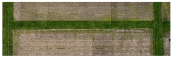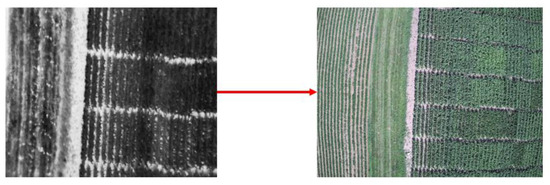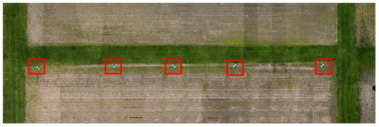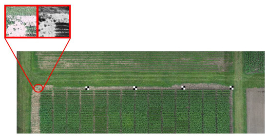 Five checkerboard targets, used as check points, were deployed in the calibration field for the FLIR and Sony cameras. The ground coordinates of all the checkerboard targets were surveyed by a Topcon GR-5 GNSS receiver with an accuracy of 2–3 cm. The checkerboard targets were identified in raw and orthorectified images to either solve for the unknowns in the GNSS/INS-assisted bundle adjustment with system self-calibration process or check orthorectification accuracy, depending on the method implemented, respectively. Figure 12 shows full-size thermal and RGB imagery captured by the FLIR Duo Pro R camera. Here, it is clear that the angular field of view of the RGB is much larger than that of the thermal. Figure 13 shows the data collection area with enhanced representations of checkerboard targets and a zoomed region of the targets in the thermal and RGB images of the FLIR camera. Figure 14 shows sample RGB imagery captured by the Sony Alpha 7R. Figure 15 shows the flight area of the Sony Alpha 7R calibration field with the five checkerboard targets.