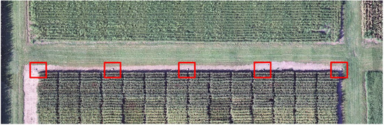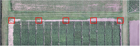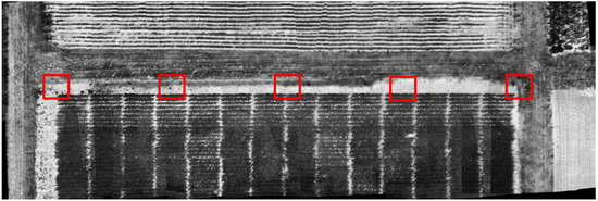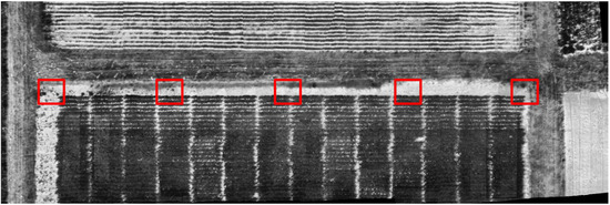 Orthophoto result ignoring the time delay using the refined trajectory data for FLIR RGB July 25th data collection (red boxes show the location of the check points, ).