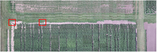 Orthophoto result ignoring the time delay using the original trajectory data for FLIR RGB July 25th data collection (red boxes show the location of the check points—only two visible, ).