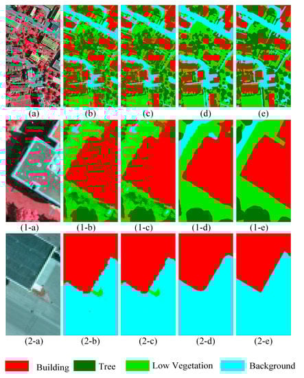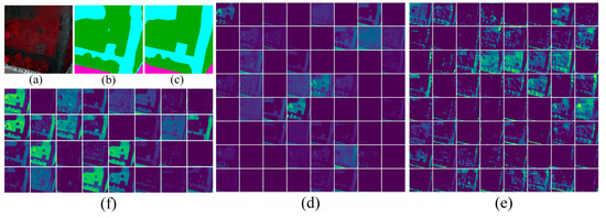 Unlike the first layer, more abstract features occurred in the ninth layers, as shown in Figure 5e. Edge information between different classes was becoming clearer. As shown in the bottom-left part of and the upper right part of , the edge between building and vegetation could be recognized. Additionally, the characteristics of different classes were shown, such as , which was representative of vegetation, and which was representative of background. Although edge information and characteristics could be seen in this layer, the boundary between different classes was not clear.