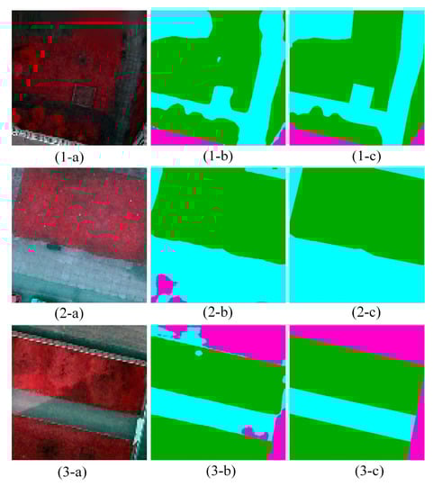Almost all class-specific accuracies of the three simulated results were higher than 80%, except for PA of building. The details of the confusion matrices of the three results showed that the pixels misclassified as background contributed to the low accuracy. However, PA of building was the highest among the three classes, and equaled 91%. PA of vegetation and background were almost equal, which was 82%.