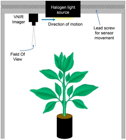 Hyperspectral images were collected at the end of a four-week period after start of experiment with a Headwall Nano-Hyperspec (VNIR) imager (Headwall Photonics, Inc., Bolton, MA, USA). This sensor collects spectral information for 274 bands from 400–1000 nm at 2 nm intervals with a Full-Width Half-Maximum (FWHM) of around 5 nm. The last two bands were removed from all images during pre-processing to eliminate noise. A halogen lamp was used as a full-spectrum artificial light source to control lighting and to mitigate any atmospheric corrections required from using the sun for illumination. Using an artificial light source also allows for consistent imaging despite weather conditions. A 10” square Labsphere Spectralon® white reflectance standard was used only for light calibration; dark calibration was done using the lens cap. The headwall sensor was mounted in a nadir position to a custom-made, 3 m-tall gantry system (Figure 1) that used a lead screw to move the sensor at a rate of 0.635 m min−1 at 1.2 m above canopy to image each plant individually. The gantry system allows for line-scanning of whole plants and mimics the line-scanning methods also applied at a field-scale with an unmanned aerial vehicle. Plant heights did not vary appreciably in the greenhouse study.