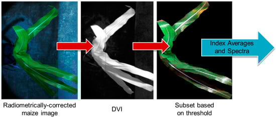 Image processing workflow. The Difference Vegetation Index was used to create a mask on radiometrically-corrected images with a threshold of values. Once masked, reflectance indices are only calculated and averaged on parts of images containing vegetation. Reflectance index averages and reflectance spectra were then output for statistical analyses. Indices and spectra were averaged pixel-by-pixel for each image.