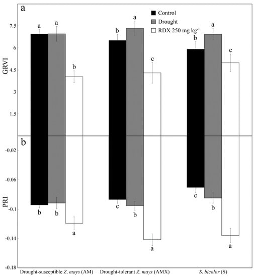 Comparison of reflectance indices for all three plant types and groups: (a) Green Ratio Vegetation Index (GRVI) average values. (b) Photochemical Reflectance Index (PRI) average values. n = 8 for all groups less S. bicolor control (n = 7) and AM Z. mays exposed to RDX (n = 7). Error bars represent standard deviations.
