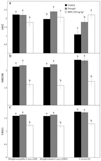 Comparison of reflectance indices for all three plant types and groups: (a) Average Anthocyanin Reflectance Index 2 values. (b) Modified Red Edge Simple Ratio (MRESR) average values. (c) Vogelmann Red Edge Index 1 (VREI1) average values. n = 8 for all groups less S. bicolor control (n = 7) and AM Z. mays exposed to RDX (n = 7). Error bars represent standard deviations.