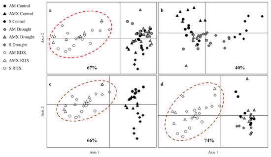 Principle Components Analyses of (a) control, drought, and RDX groups; (b) control and drought groups; (c) control and RDX groups; and (d) drought and RDX groups. Each PCA includes all plant types. Ovals indicated separation between groups. Percentages define the variance explained by Axis 1. n = 8 for all groups less S. bicolor control (n = 7) and AM Z. mays exposed to RDX (n = 7) that had one mortality.