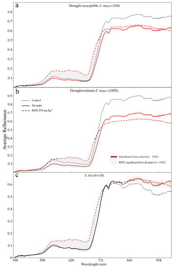 Average reflectance spectra of control, drought, and RDX groups for (a) drought-susceptible (AM) Z. mays, (b) drought-tolerant (AMX) Z. mays, and (c) S. bicolor (S). Line portions in red signify statistical difference from controls (α = 0.05). Shaded regions indicate statistical significance between drought and RDX groups (α = 0.05). n = 8 for all groups less S. bicolor control (n = 7) and AM Z. mays exposed to RDX (n = 7).
