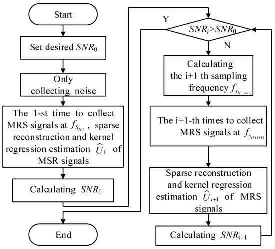 Although high sampling frequency can obtain plenty of signal information, it also has the disadvantages of containing a large amount of data as well as much more time taken in signal processing. Hence, the ISSR-KRE approach is proposed to achieve small amount of final data and random noise suppression, and the approach is implemented by the steps, as shown in Figure 2. The ISSR-KRE approach mainly consists of the following steps: (i) Setting the desired SNR, (ii) only collecting noise recording, (iii) at the first time, the signal is collected and estimated, (iv) determining to increase the sampling frequency based on the desired SNR, and (v) at the next time, the signal is collected and estimated.
