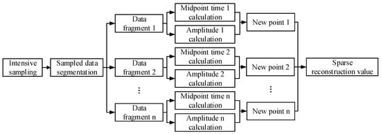 After determining and , the specific steps of ISSR is proposed in Figure 3. The ISSR method mainly includes: (i) Intensive sampling, (ii) sampled data segments, (iii) estimating the time and amplitude of each segment data to form a new reconstructed point, and (iv) sparse reconstructed signal is formed from the new reconstructed points calculated for each segment.