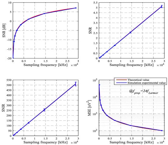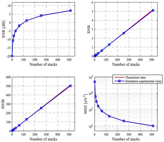 The curves in Figure 6 are statistically obtained from 20 experimental simulations. In each simulation, the SNR of synthesized noisy signal is −20 dB. In Figure 6, the first row shows the curves of power signal to noise ratio by logarithmic representation and the curves of power signal-to-noise ratio by non-logarithmic representation, respectively. The unit of SNR by logarithmic representation is dB. The unit of SNR by non-logarithmic representation is 1. The second row shows the curves of SNIR for power and MSE, respectively. The unit of SNIR for power is 1. The unit of MSE is nV2. The blue lines display simulation experimental value, and the red lines display the theoretical value.