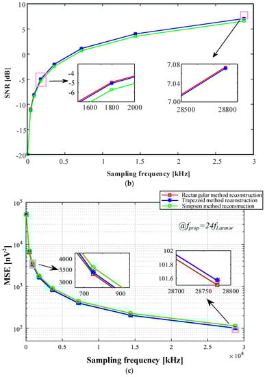 Further, we utilize the Simpson method estimation to study the improvement of SNR in the case where the acquired noisy signal contains Gaussian random noise. Assuming that the standard deviation of the zero-mean Gaussian distribution white noise is , i.e., , then for a single point sampling where the MRS signal is , SNR for voltage at is Equation (A26).