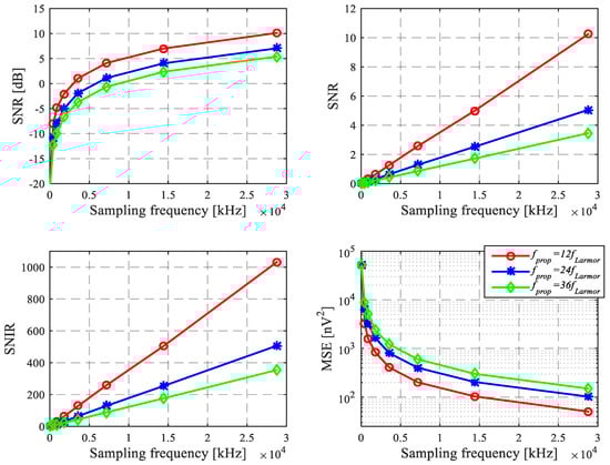 From Figure 6, SNR and SNIR are proportional to the sampling frequency when is constant. MSE is inversely proportional to . The experiments show that the sparse reconstruction of rectangular method is feasible to suppress random noise, and Equations (7) and (8) are verified.