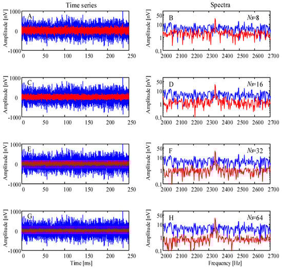 In Figure 5, the left-hand column is the time-series. The blue lines display the time-series of the sampling frequency . The red lines display the time-series of rectangular sparse reconstruction by different sampling frequencies. The right-hand column is the spectra. The blue lines display the spectra of the time-series of the sampling frequency , and the red lines display the spectra of the time-series of rectangular sparse reconstruction by different sampling frequencies that correspond to the left-hand column.