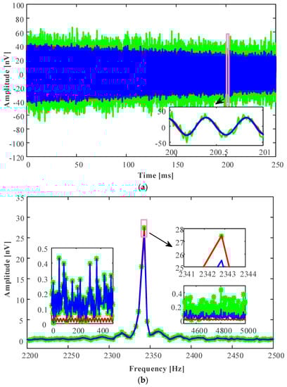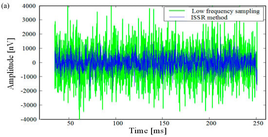 Comparison of low frequency sampling result and the ISSR method results. The green lines display low frequency sampling recording (its sampling frequency is 8330 Hz) and the standard deviation is 1200.80 nV. The blue lines display the data by the ISSR method (its sampling frequency is 50 kHz, = 8333.3 Hz) and the standard deviation is 570.01 nV. (a) Comparison in time domain. (b) Comparison in frequency domain.
