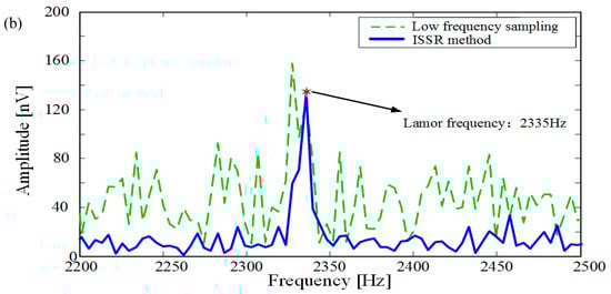 We provide an approach to suppress random noise by utilizing high sampling frequency in the MRS instrument. In the approach, the basic frequency of sparse reconstruction is one of the ISSR keys. This basic frequency is accurately calculated according to Equation (5) to avoid frequency offset and distortion of MRS signal. In the case where the sampling frequency is constant, the magnitude of basic frequency is inversely related to the SNIR of signal in intensive sampling sparse reconstruction, as shown in Figure 9.