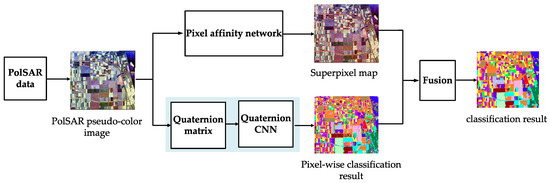 In this paper, a supervised PolSAR image classification algorithm combining learned superpixels and QCNN is proposed. Three main steps are included: (1) pseudo-color image construction over the Pauli decomposition for PolSAR data; (2) superpixel generation of PolSAR pseudo-color image using PAN; (3) pseudo-color image classification by QCNN combined with superpixels. The framework of the proposed approach is shown in Figure 1. For the PolSAR pseudo-color image classification, QCNN is applied to exploit deep color features that considers the correlation among color channels. Besides, PAN is employed to learn superpixels and obtain reliable superpixel segmentation maps, which is benefit to improve the PolSAR pseudo-color image classification results.