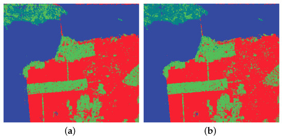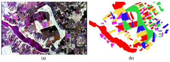 When , . The PolSAR pseudo-color image can be constructed over the Pauli decomposition: , , are assigned to red, green and blue component, respectively [43].